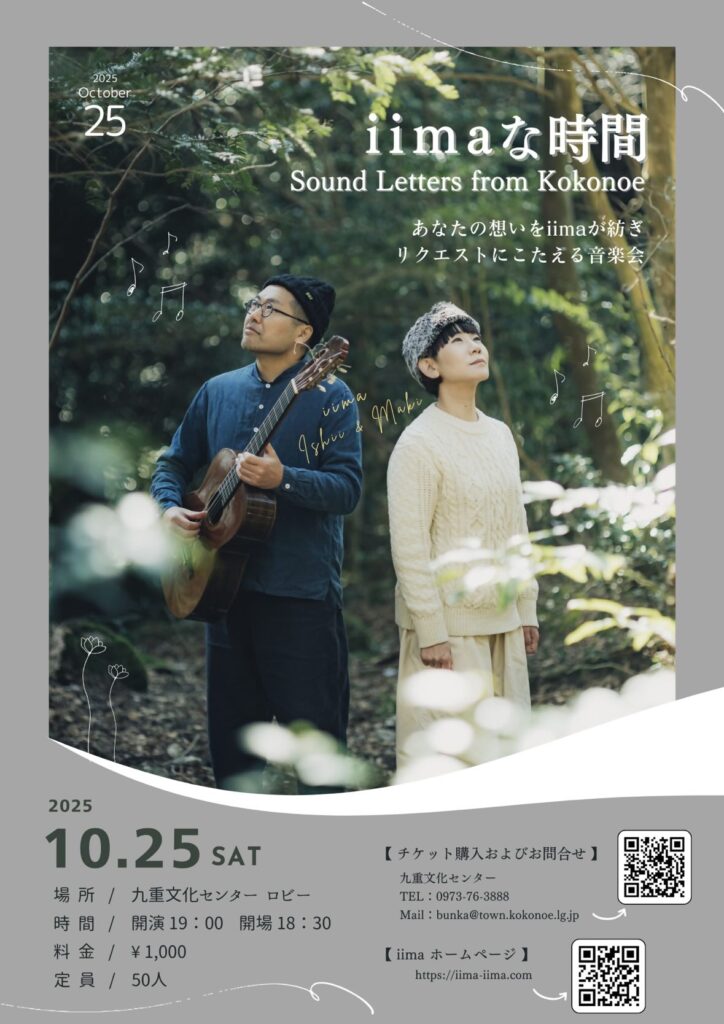 このたび、九重町の皆さんに向けて、福岡を拠点に活動する音楽ユニット iima(イーマ) をお迎えし、コンサートを開催します。