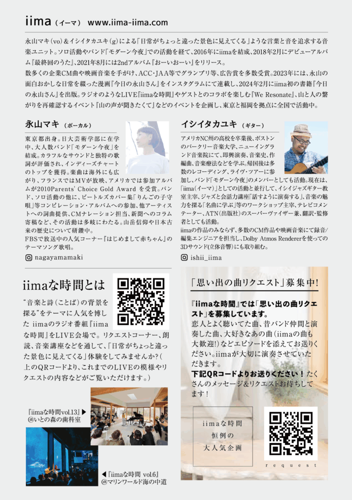 恋人とよく聴いてた曲、昔バンド仲間と演奏した曲、大好きなあの曲(iimaの曲も大歓迎!)などエピソードを添えてお送りください。iimaが大切に演奏させていただきます。右記QRコードよりお送りください!たくさんのメッセージ&リクエストお待ちしてます!
