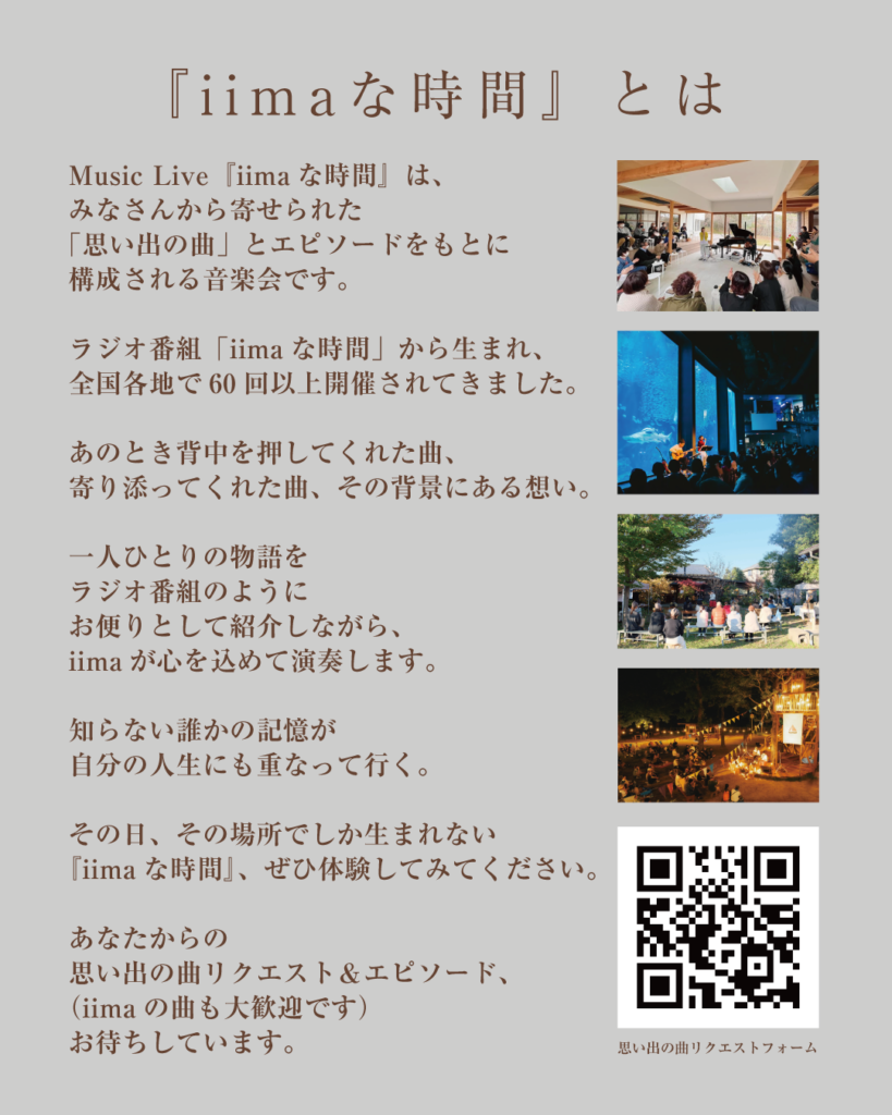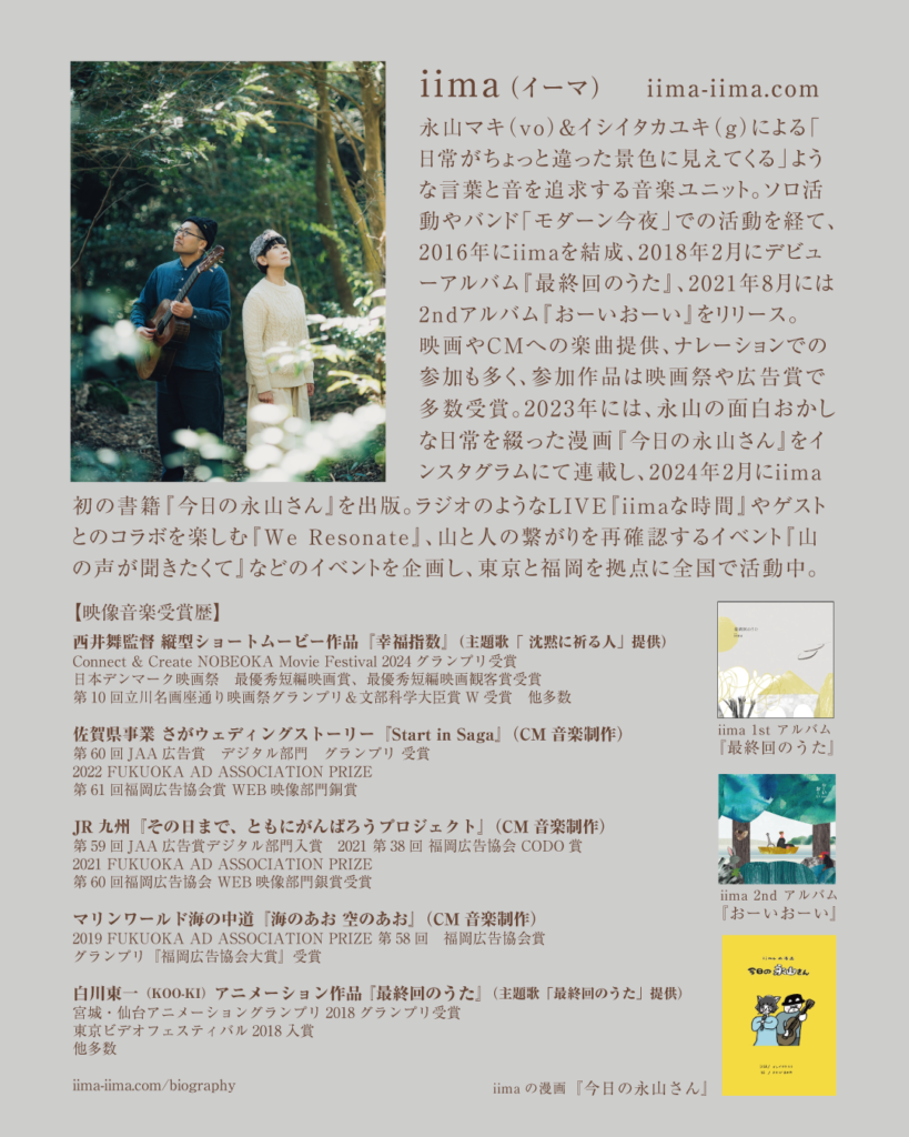 iimaの楽曲は自分の心と重なる部分が多く、あたたかく寄り添ってくれるような、じんわりと元気をもらえるような作品たちがいっぱい。AnRiccoアトリエでもそんな優しさがあなたを包んでくれるようなライブになると思います。