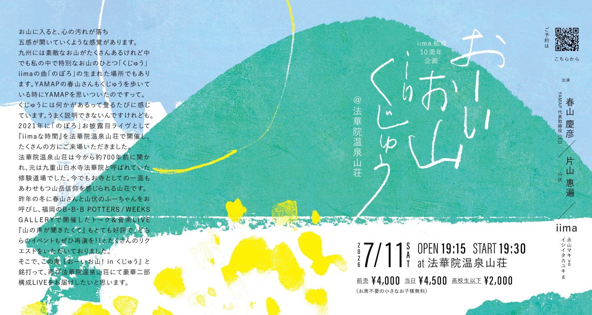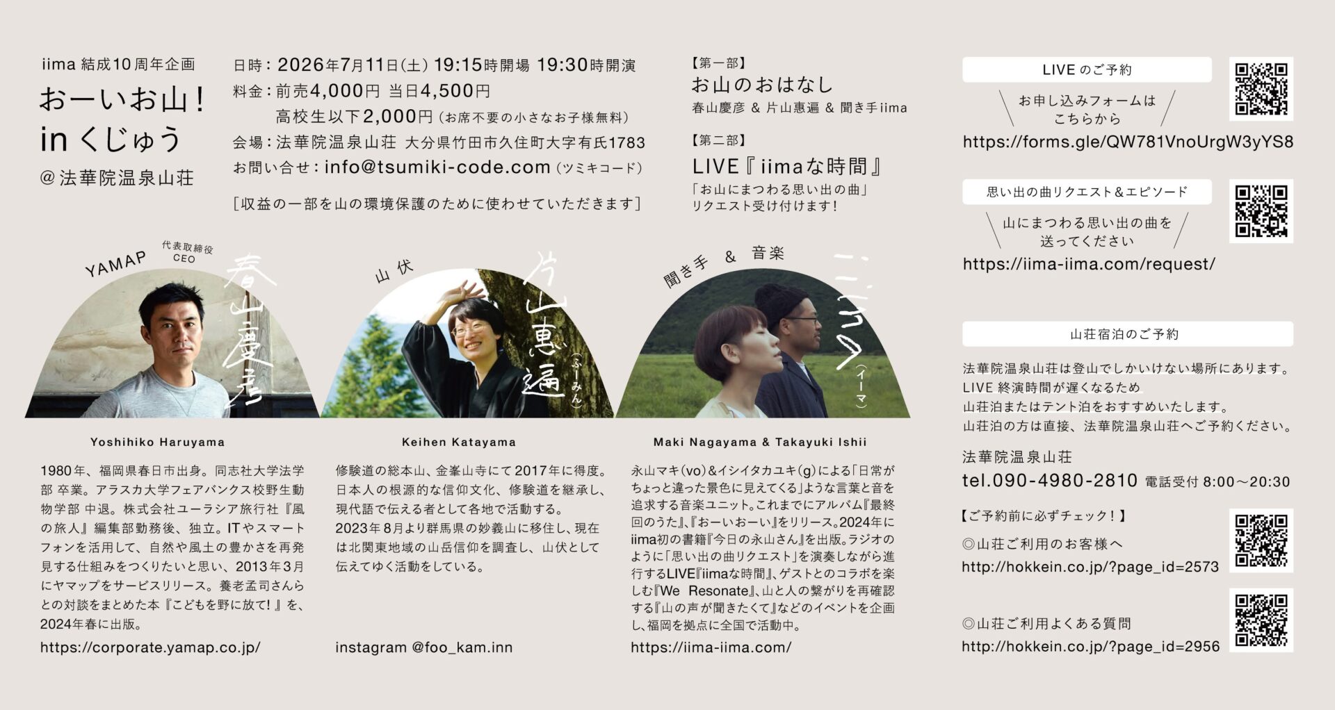 iima結成10周年企画iima結成10周年企画 2026年7月11日(土)『おーいお山!in くじゅう』@法華院温泉山荘iima結成10周年企画